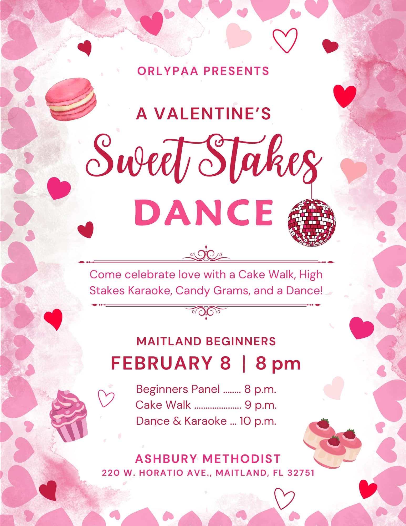 ORLYPAA and Maitland Beginners invite you to join them for a Valentine’s Day event with a beginners panel at 8pm, followed by a cake walk at 9pm and a dance with high stakes karaoke at 10pm.